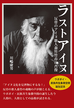 タイトルにぎょっとする。『ラストアイヌ――反骨のアイヌ歌人森竹竹市の肖像』(発行・柏艪舎、発売・星雲社)。しかも表紙の写真が強烈だ。射るような鋭いまなざし。長く伸びた白い顎髭。ただものではない雰囲気が漂う。ページをめくると、何か荒々しい壮大な物語が始まりそうな予感に満ちている。