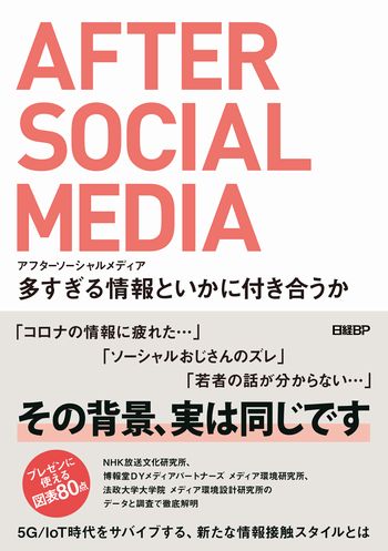 書名を見ても内容はすぐに思い浮かばない。サブタイトルを見て、「ははあ」こういうことなのかと少しイメージが浮かんでくる。本書『アフターソーシャルメディア』(日経BP社)は現代の「情報過多社会」のなかで、個人が多すぎる情報とどう付き合っていけばいいのかを多くの調査データとともに考えさせてくれる。執筆者はメディア関連企業の第一線で働く人たちや法政大学社会学部、NHK放送文化研究所、博報堂DYメディアパートナーズのスタッフ8人。それぞれの出身元が調査してきた豊富なデータをもとに、それを解説する形で構成されている。編集は法政大学大学院メディア環境設計研究所。